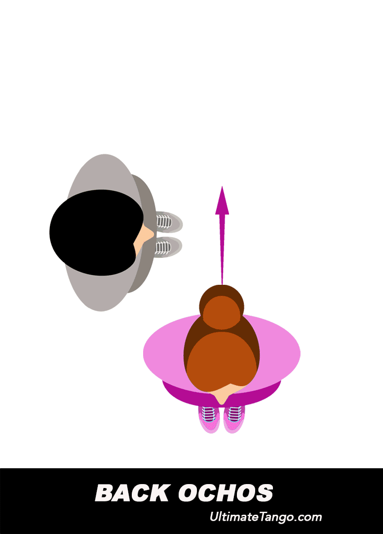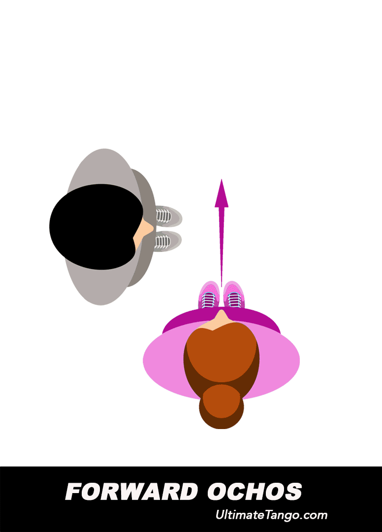 Therefore, to execute one ocho, one requires 2 steps going in the opposite directions. In order to achieve the effect of crossing in the middle (just like figure 8 does) – the two steps need to be crosses (forward crosses or back crosses).
